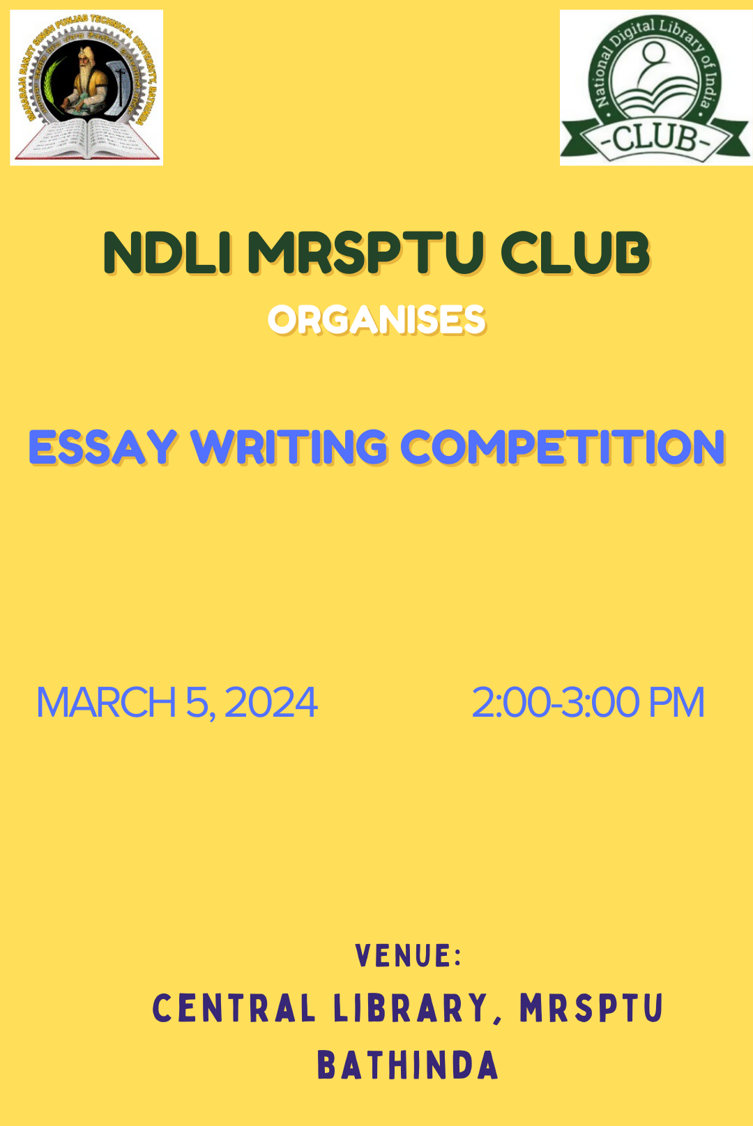 MRSPTU NDLI club organising Eassy Writing Competition on 5th March, 2024 at 2pm to 3pm. Only NDLI Club members can participate in the event. For more details, Kindly contact to Central Library Staff.